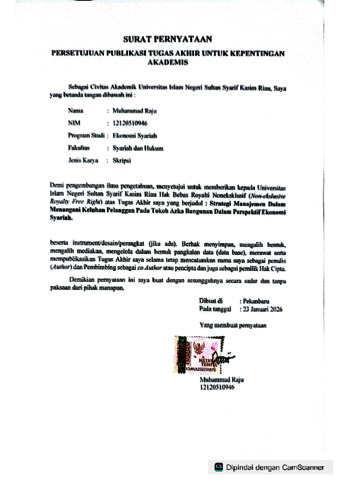 MUHAMMAD RAJU, - (2026) STRATEGI MANAJEMEN DALAM MENANGANI KELUHAN PELANGGAN PADA TOKO AZKA BANGUNAN DALAM PERSPEKTIF EKONOMI SYARIAH. Skripsi thesis, UNIVERSITAS ISLAM NEGERI SULTAN SYARIF KASIM RIAU.