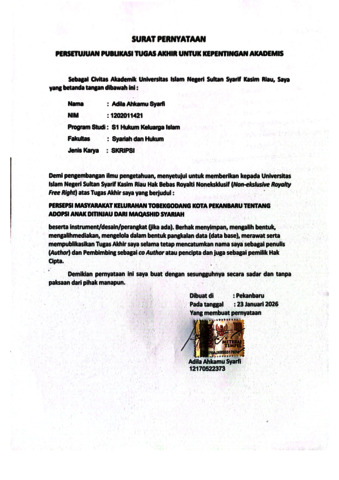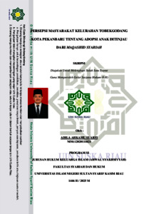 ADILA AHKAMU SYARFI, - (2026) “PERSEPSI MASYARAKAT KELURAHAN TOBEKGODANG KOTA PEKANBARU TENTANG ADOPSI ANAK DITINJAU DARI MAQASHID SYARIAH”. Skripsi thesis, UNIVERSITAS ISLAM NEGERI SULTAN SYARIF KASIM RIAU.