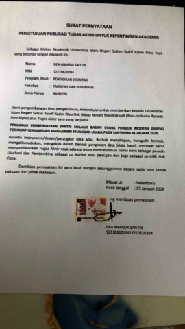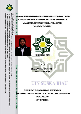 DEA ANANDA SAFITRI, - (2026) PENGARUH PEMBERDAYAAN SANTRI MELALUI BADAN USAHA PONDOK MODERN (BUPM) TERHADAP KEMAMPUAN MANAJEMEN KEUANGAN USAHA PADA SANTRI MA AL-JAUHAR DURI. Skripsi thesis, Universitas Islam Negeri Sultan Syarif Kasim Riau.