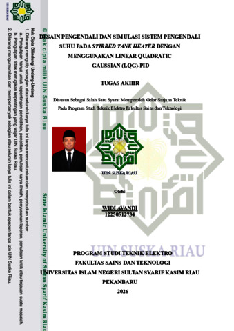WIDI AVANDI (2026) Desain Pengendali dan Simulasi Sistem Pengendali Suhu pada Stirred Tank Heater Mengguanakan Linear Quadratic Gaussian (LQG) - PID. Skripsi thesis, Universitas Islam Negeri Sultan Syarif Kasim.