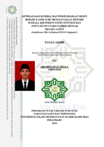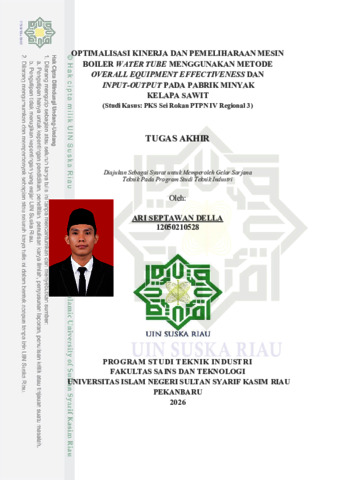 OPTIMALISASI KINERJA DAN PEMELIHARAAN MESIN BOILER WATER TUBE MENGGUNAKAN METODE OVERALL EQUIPMENT EFFECTIVENESS DAN INPUT-OUTPUT PADA PABRIK MINYAK KELAPA SAWIT (Studi Kasus: PKS Sei Rokan PTPN IV Regional 3) ARI SEPTAWAN DELLA 12050210528 Program Studi Teknik Industri Fakultas Sains dan Teknologi Universitas Islam Negeri Sultan Syarif Kasim Riau Jl. HR. Soebrantas KM. 18 No. 15 Pekanbaru ABSTRAK Mesin boiler water tube merupakan peralatan utama dalam pabrik minyak kelapa sawit yang berfungsi menyediakan uap untuk mendukung proses produksi secara berkelanjutan. Permasalahan dalam kajian ini adalah terjadinya penurunan dan fluktuasi kinerja mesin boiler water tube. Penurunan kinerja boiler dapat meningkatkan konsumsi energi dan risiko kegagalan komponen. Kajian ini bertujuan untuk mengidentifikasi dan faktor-faktor penyebab penurunan kinerja dan memberikan usulan perbaikan untuk meminimalisir kinerja mesin. Penelitian ini dilakukan di PKS Sei Rokan PTPN IV Regional 3 pada periode 1-30 Oktober 2025. Metode yang digunakan ialah overall equipment effectiveness (OEE) dan metode input–output. Hasil analisis menyebutkan bahwa analisis OEE yang digunakan untuk menilai efektivitas operasional mesin memiliki rata-rata sebesar 56,72%, sedangkan analisis input–output yang digunakan untuk mengevaluasi efisiensi energi memiliki ratarata sebesar 82,40%. Hasil analisis menunjukkan bahwa kinerja boiler mengalami fluktuasi dengan penurunan efisiensi hingga 70,16% serta penurunan nilai OEE yang dipengaruhi oleh downtime dan gangguan operasional. Berdasarkan hasil tersebut, direkomendasikan penerapan pemeliharaan preventif dan pemantauan kinerja secara berkelanjutan guna meningkatkan keandalan dan kinerja mesin boiler. Kata Kunci : Efektivitas Mesin, Efisiensi Mesin, Boiler Pipa Air, Metode Langsung, Metode OEE