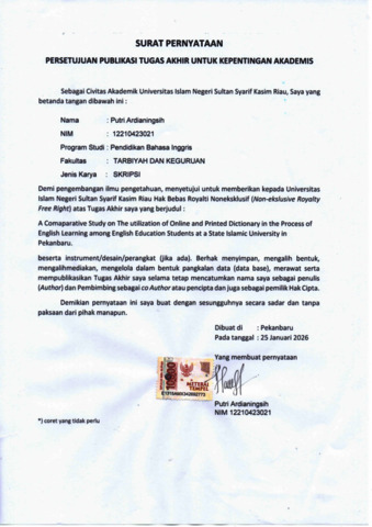 PUTRI ARDIANINGSIH, - (2026) A COMPARATIVE STUDY ON THE UTILIZATION OF ONLINE AND PRINTED DICTIONARIES IN THE PROCESS OF ENGLISH LEARNING AMONG ENGLISH EDUCATION STUDENTS AT A STATE ISLAMIC UNIVERSITY IN PEKANBARU. Skripsi thesis, UNIVERSITAS ISLAM NEGERI SULTAN SYARIF KASIM RIAU.