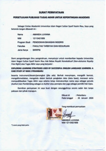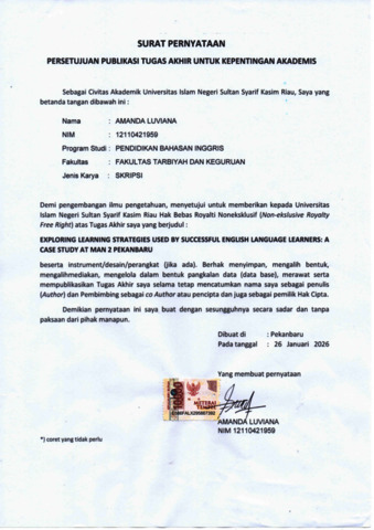 AMANDA LUVIANA, - (2026) EXPLORING LEARNING STRATEGIES USED BY SUCCESSFUL ENGLISH LANGUAGE LEARNERS A CASE STUDY AT MAN 2 PEKANBARU. Skripsi thesis, UNIVERSITAS ISLAM NEGERI SULTAN SYARIF KASIM RIAU.
