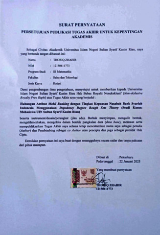 THORIQ ZHAHIR, - (2026) HUBUNGAN ATRIBUT MOBILE BANKING DENGAN TINGKAT KEPUASAN NASABAH BANK SYARIAH INDONESIA MENGGUNAKAN DEPEDENCY DEGREE ROUGH SETS THEORY (STUDI KASUS: MAHASISWA UIN SULTAN SYARIF KASIM RIAU). Skripsi thesis, UNIVERSITAS ISLAM NEGERI SULTAN SYARIF KASIM RIAU.
