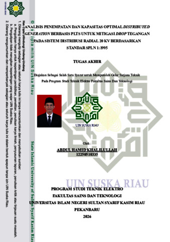 ABDUL HAMID KHALILULLAH, - (2026) ANALISIS PENEMPATAN DAN KAPASITAS OPTIMAL DISTRIBUTED GENERATION BERBASIS PLTS UNTUK MITIGASI DROP TEGANGAN PADA SISTEM DISTRIBUSI RADIAL 20 KV BERDASARKAN STANDAR SPLN 1:1995. Skripsi thesis, UNIVERSITAS ISLAM NEGERI SULTAN SYARIF KASIM RIAU.
