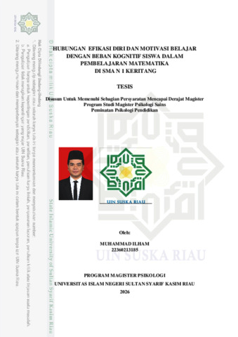HUBUNGAN EFIKASI DIRI DAN MOTIVASI BELAJAR DENGAN BEBAN KOGNITIF SISWA DALAM PEMBELAJARAN MATEMATIKA DI SMA N 1 KERITANG Muhammad Ilham Muhammadilham.mi377@gmail.com Magister Psikologi Universitas Islam Negeri Sultan Syarif Kasim Riau ABSTRAK Penelitian ini bertujuan untuk menguji hubungan efikasi diri dan motivasi belajar dengan beban kognitif siswa dalam pembelajaran matematika. Subjek penelitian berjumlah 240 siswa SMA Negeri 1 Keritang yang dipilih dengan teknik stratified cluster sampling. Metode penelitian yang digunakan adalah kuantitatif dengan pendekatan korelasional. Instrumen penelitian berupa skala efikasi diri yang dimodifikasi dari Self-Efficacy of Learning and Performance, skala motivasi belajar yang dimodifikasi dari Academic Motivation Scale, serta skala beban kognitif yang dimodifikasi dari Cognitive Load Questionnaire. Hasil uji penelitian menunjukkan adanya hubungan yang signifikan antara efikasi diri dan motivasi belajar dengan beban kognitif (p = 0,00) yakni sebesar (R2 = 0,675). Secara parsial, terdapat hubungan yang negatif secara signifikan antara efikasi diri dengan beban kognitif (p = 0,00) sebesar -0,754, serta hubungan negatif yang signifikan antara motivasi belajar dengan beban kognitif (p = 0,00) sebesar -0,808. Temuan ini mengindikasikan bahwa semakin tinggi efikasi diri dan motivasi belajar siswa maka akan semakin rendah beban kognitif siswa ketika mempelajari matematika. Penelitian ini memberikan implikasi bahwa penguatan efikasi diri dan peningkatan motivasi belajar siswa dapat menjadi strategi untuk mengoptimalkan proses pembelajaran matematika sehingga beban kognitif yang dialami siswa menjadi berkurang. Kata kunci: efikasi diri, motivasi belajar, beban kognitif, pembelajaran matematika
