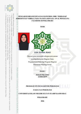 PENGARUH RELIGIUSITAS DAN KONTROL DIRI TERHADAP AGRESIVITAS VERBAL PADA WANITA DEWASA AWAL PENGGUNA FACEBOOK DI PEKANBARU Indah Pratiwi Fakultas Psikologi Program Studi Magister Psikologi Universitas Sultan Syarif Kasim Riau Indahpratiwi0030@gmail.com Abstrak Agresivitas verbal merupakan komunikasi berupa ejekan, pelecehan dan kata-kata yang mengandung unsur menyakiti orang lain. Penelitian ini bertujuan untuk melihat pengaruh antara religiusitas dan kontrol diri terhadap agresivitas verbal pada wanita dewasa awal pengguna facebook di Pekanbaru. Penelitian ini menggunakan metode kuantitatif dengan analisis regresi linear berganda. Subjek dalam penelitian ini sebanyak 347 wanita dewasa awal pengguna Facebook yang diambil dengan menggunakan Purposive Sampling. Berdasarkan hasil penelitian yang dilakukan terdapat pengaruh negative antara religiusitas dan kontrol diri terhadap agresivitas verbal pada wanita dewasa awal pengguna facebook di Pekanbaru dengan nilai signifikan 0,000 dan koefisien Korelasi religiusitas terhadap agresivitas verbal -0,538 dan koefisien korelasi kontrol diri terhadap agresivitas verbal -0,462. Artinya semakin tinggi religiusitas dan kontrol diri maka semakin rendah agresivitas verbal pada wanita dewasa awal pengguna facebook, dan sebaliknya semakin rendah relgiusitas dan kontrol diri maka semakin tinggi agresivitas verbal pada wanita dewasa awal pengguna facebook. Dengan demikian, religiusitas dan kontrol diri yang dimiliki wanita dewasa awal pengguna facebook memiliki pengaruh terhadap agresivitas verbal. Kata kunci: Religiusitas, Kontrol Diri, Agresifitas Verbal, Wanita dewasa awal, Facebook