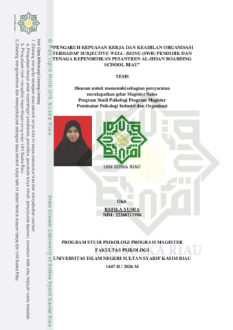 PENGARUH KEPUASAN KERJA DAN KEADILAN ORGANISASI TERHADAP SUBJECTIVE WELL- BEING PENDIDIK DAN TENAGA KEPENDIDIKAN PESANTREN AL-IHSAN BOARDING SCHOOL RIAU Refila Yusra Magister Psikologi Universitas Islam Negeri Sultan Syarif Kasim Riau ABSTRAK Subjective well-being (SWB) merupakan salah satu indikator penting dalam menilai kesejahteraan individu, yang mencakup aspek kepuasan hidup, emosi positif, dan emosi negatif. Penelitian ini bertujuan untuk menguji pengaruh kepuasan kerja dan keadilan organisasi terhadap subjective well-being pendidik dan tenaga kependidikan (PTK) di Pondok Pesantren Al-Ihsan Boarding School Riau. Penelitian ini melibatkan 135 PTK yang dipilih menggunakan teknik simple random sampling. Pengumpulan data dilakukan dengan menggunakan beberapa skala yaitu skala kepuasan kerja yang diadaptasi dengan nilai alpha Cronbach 0,721, skala keadilan organisasi yang diadaptasi dengan nilai alpha Cronbach 0,749, skala Satisfaction With Life yang diadaptasi dengan nilai alpha Cronbach 0,772, serta skala Positive and Negative Affect dengan nilai alpha Cronbach 0,745. Data dianalisis menggunakan regresi linear berganda untuk menguji hubungan antar variabel pada program SPSS vs. 27. Hasil penelitian menunjukkan bahwa kepuasan kerja dan keadilan organisasi memiliki pengaruh yang signifikan dan positif terhadap subjective well-being pendidik dan tenaga kependidikan di pesantren al-ihsan boarding school Riau. Temuan dalam penelitian ini menujukkan bahwa kepuasan kerja menjadi faktor terbesar dalam memberikan sumbangsih subjective well-being pendidik dan tenaga kependidikan di pesantren. Implikasi dalam penelitian ini adalah kepuasan kerja dan keadilan organisasi memliki peran penting untuk meningkatkan subjective well-being pendidik dan tenaga pendidik pesantren. Kata Kunci : Kepuasan kerja, Keadilan Organisasi, Subjective well-being
