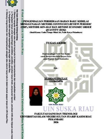 YUSRIANI DAULAY, - (2026) PENGENDALIAN PERSEDIAAN BAHAN BAKU KEDELAI MENGGUNAKAN METODE CONTINUOUS REVIEW PERIODIC (CRP), METODE MIN-MAX DQN METODE ECONOMIC ORDER QUANTITY (EOQ). Skripsi thesis, UNIVERSITAS ISLAM NEGERI SULTAN SYARIF KASIM RIAU.