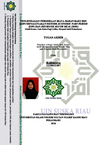 MARDIANA, - (2026) PENGENDALIAN PERSEDIAAN BIAYA BAHAN BAKU BIJI KOPI MENGGUNAKAN METODE ECONOMIC PART PERIOD (EPP) DAN HEURISTIK SILVER MEAL (HSM). Skripsi thesis, UNIVERSITAS ISLAM NEGERI SULTAN SYARIF KASIM RIAU.