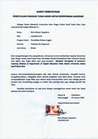RIRIN MAISYA TAQYDARIA, - (2026) STUDENTS’ PERCEPTION OF LECTURER’S TEACHING METHOD AT DEPARTMENT OF ENGLISH EDUCATION. Skripsi thesis, UNIVERSITAS ISLAM NEGERI SULTAN SYARIF KASIM RIAU.