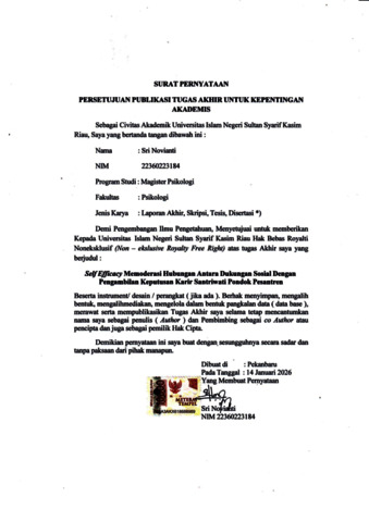 Self Efficacy Memoderasi Hubungan Antara Dukungan Sosial Dengan Pengambilan Keputusan Karir Santriwati Pondok Pesantren Sri Novianti novianticici151821@gmail.com Magister Psikologi Universitas Islam Negeri Sultan Syarif Kasim Riau ABSTRAK Santriwati di pondok pesantren menghadapi tantangan unik dalam pengambilan keputusan karir, yang dipengaruhi oleh lingkungan pendidikan yang menekankan nilai-nilai keagamaan dan seringkali terbatas dalam eksposur terhadap dunia kerja modern. Penelitian ini bertujuan untuk menganalisis peran self-efficacy sebagai moderator dalam hubungan antara dukungan sosial dan pengambilan keputusan karir pada santriwati di Pondok Pesantren. Metode yang digunakan adalah kuantitatif korelasional dengan sampel sebanyak 200 santriwati kelas 11 dan 12 yang dipilih menggunakan teknik cluster sampling. Pengumpulan data dilakukan dengan menggunakan skala Career Decision Ambiguity Tolerance (Xu & Tracey, 2015), Multidimensional Scale of Perceived Social Support (Zimet et al., 1988), dan General Self-Efficacy Scale (Schwarzer & Jerusalem, 1995). Hasil penelitian menunjukkan bahwa: (1) terdapat hubungan yang signifikan antara dukungan sosial dengan pengambilan keputusan karir; (2) tidak terdapat hubungan yang signifikan antara self-efficacy dengan pengambilan keputusan karir; dan (3) self-efficacy tidak terbukti memoderasi hubungan antara dukungan sosial dan pengambilan keputusan karir. Temuan ini mengindikasikan bahwa dalam konteks pesantren yang kolektivis dan hierarkis, dukungan sosial—terutama dari teman sebaya—memiliki pengaruh langsung yang kuat dalam memandu keputusan karir, sementara peran keyakinan diri individu (self-efficacy) menjadi tidak signifikan. Kata Kunci: Dukungan Sosial, Self-Efficacy, Pengambilan Keputusan Karir, Santriwati, Pondok Pesantren.