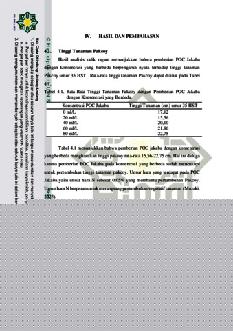 PERTUMBUHAN DAN HASIL PAKCOY (Brassica rapa L.) DENGAN PEMBERIAN PUPUK ORGANIK CAIR JAKABA Dio Sahputra (12180212237) Di Bawah Bimbingan Rita Elfianis dan Syukria Ikhsan Zam INTISARI Jakaba merupakan sumber pupuk organik untuk menyuburkan tanaman, dan dapat menggantikan pupuk anorganik. Salah satu tanaman holtikultura yang dapat memanfaatkan POC Jakaba adalah tanaman pakcoy. Penelitian ini bertujuan untuk mendapatkan konsentrasi pupuk organik cair Jakaba terbaik terhadap pertumbuhan dan hasil Pakcoy. Penelitian dilaksanakan pada Januari sampai Maret 2025 di lahan UARDS Fakultas Pertanian dan Peternakan Universitas Islam Negeri Sultan Syarif Kasim Riau. Metode yang digunakan adalah metode eksperimen dengan Rancangan Acak Lengkap (RAL) satu faktor, yaitu konsentrasi POC Jakaba yang terdiri dari lima taraf perlakuan yaitu P0 (0 ml/L), P1 (20 ml/L), P2 (40 ml/L), P3 (60 ml/L), dan P4 (80 ml/L), masing-masing perlakuan di ulangan sebanyak 10 kali sehingga terdapat 50 unit percobaan. Parameter yang diamati meliputi tinggi tanaman, jumlah daun, panjang daun, lebar daun, berat basah tanaman, berat kering tanaman dan panjang akar. Hasil penelitian menunjukkan bahwa pemberian POC Jakaba dengan konsentrasi 40 ml/L dalam meningkatkan jumlah daun, panjang daun, dan berat basah tanaman pakcoy. Kata kunci: Konsentrasi, Rancangan Acak Lengkap, Tanaman