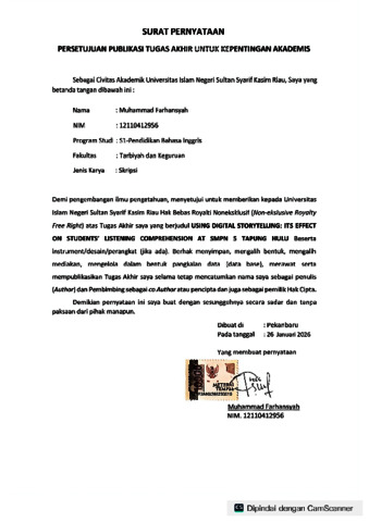 -, MUHAMMAD FARHANSYAH (2026) USING DIGITAL STORYTELLING: ITS EFFECT ON STUDENTS’ LISTENING COMPREHENSION AT SMPN 5 TAPUNG HULU. Skripsi thesis, Uin Sultan Syarif Kasim Riau.