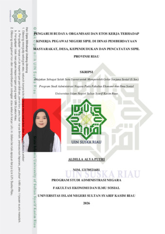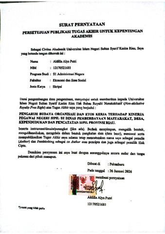 ABSTRAK PENGARUH BUDAYA ORGANISASI DAN ETOS KERJA TERHADAP KINERJA PEGAWAI NEGERI SIPIL DI DINAS PEMBERDAYAAN MASYARAKAT, DESA, KEPENDUDUKAN, DAN PENCATATAN SIPIL PROVINSI RIAU Oleh: ALDILLA ALYA PUTRI NIM : 12170521681 Penelitian ini bertujuan untuk mengetahui pengaruh budaya organisasi dan etos kerja terhadap pegawai negeri sipil di Dinas Pemberdayaan Masyarakat, Desa, Kependudukan dan Pencatatan Sipil Provinsi Riau. Penelitian ini merupakan jenis penelitian kuantitatif yang hasilnya berupa pengukuran berupa angka yang dihasilkan dari keadaan sebenarnya. Teknik pengambilan data dilakukan dengan menggunakan kuesioner dan dokumentasi. Populasi dalam penelitian ini adalah seluruh pegawai negeri sipil di Dinas Pemberdayaan Masyarakat, Desa, Kependudukan dan Pencatatan Sipil Provinsi Riau. Sampel penelitian berjumlah 60 responden dengan metode sampel jenuh. Teknik analisis data menggunakan uji kualitas data, uji asumsi klasik, uji regresi linear berganda dan uji hipotesis dengan menggunakan SPSS versi 29. Hasil yang diperoleh melalui uji parsial (uji t) dan uji simultan (uji f). Hasilnya menunjukkan bahwa terdapat pengaruh positif dan signifikan budaya organisasi dan etos kerja terhadap kinerja pegawai negeri sipil yaitu diperoleh f hitung (140,527) > f tabel (3.16) artinya positif dan nilai p value pada kolom sig 0.000 < 0.05 artinya signifikan. Kata Kunci : Budaya Organisasi, Etos Kerja, Kinerja Pegawai Negeri Sipil.