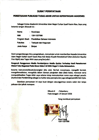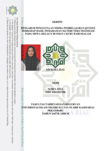 NURUL IZZA, - (2026) PENGARUH PENGGUNAAN MEDIA PEMBELAJARAN QUIZIZZ TERHADAP HASIL PEMAHAMAN MATERI TEKS NEGOSIASI PADA SISWA KELAS X DI SMA NEGERI 1 KUBU BABUSSALAM. Skripsi thesis, Universitas Islam Negeri Sultan Syarif Kasim Riau.