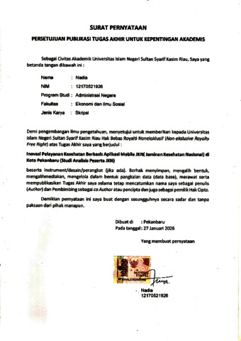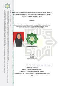 NADIA, - (2026) INOVASI PELAYANAN KESEHATAN BERBASIS APLIKASI MOBILE JKN (JAMINAN KESEHATAN NASIONAL) DI KOTA PEKANBARU ( STUDI ANALISIS PESERTA JKN). Skripsi thesis, UNIVERSITAS ISLAM NEGERI SULTAN SYARIF KASIM RIAU.