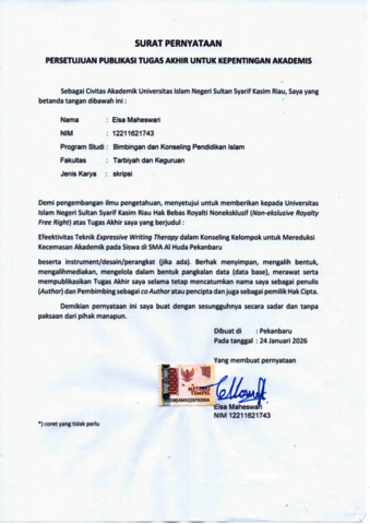 ELSA MAHESWARI, - (2026) EFEKTIVITAS TEKNIK EXPRESSIVE WRITING THERAPY DALAM KONSELING KELOMPOK UNTUK MEREDUKSI KECEMASAN AKADEMIK PADA SISWA DI SMA AL HUDA PEKANBARU. Skripsi thesis, Universitas Islam Negeri Sultan Syarif Kasim Riau.