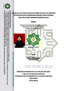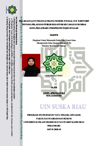 CINDY APRINA GUSLI, - (2026) PELAKSANAAN UNDANG-UNDANG NOMOR 25 PASAL 15 E TAHUN 2009 TENTANG PELAYANAN PUBLIK DI KANTOR KECAMATAN RUMBAI KOTA PEKANBARU PERSPEKTIF FIQIH SIYASAH. Skripsi thesis, UNIVERSITAS ISLAM NEGERI SULTAN SYARIF KASIM RIAU.