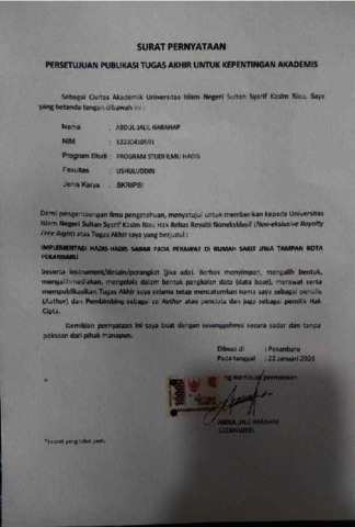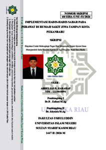 Skripsi ini berjudul “Implementasi hadis-hadis sabar pada perawat di rumah sakit jiwa Tampan kota Pekanbaru”. Sabar merupakan salah satu prilaku terpuji Dimana dengan bersabar maka kita akan menemukan makna hidup yang sesungguhnya. Oleh karena itu penelitian ini di tulis untuk menerapkan sikap sabar pada perawat di rumah sakit jiwa Tampan kota Pekanbaru dalam segala aspek kehidupan perawat. Perawat sering menghadapi tantangan seperti gangguan pasien, dan menghadapi segala sikap dari pasien. yang dapat memicu stres dan burnout. Integrasi nilai-nilai Islam, termasuk hadis sabar, menjadi penting untuk meningkatkan ketahanan psikologis dan kualitas perawatan, terutama di Rumah sakit jiwa Tampan Kota Pekanbaru sebagai pusat layanan kesehatan jiwa di Provinsi Riau. Masalah yang di teliti dalam penelitian ini yaitu bagaimana pemahaman hadis tentang sabar dan bagaimana implementasi hadis-hadis sabar pada perawat di rumah sakit jiwa Tampan kota Pekanbaru. Penelitian ini bertujuan untuk menganalisis bagaimana perawat di rumah sakit jiwa Tampan kota Pekanbaru mengimplementasikan hadis sabar dalam menyikapi gangguan pasien, serta mengidentifikasi manfaat dan tantangan penerapannya dalam konteks perawatan kesehatan jiwa. Jenis penelitian ini adalah lapangan (Field Research) dengan metode penelitian kualitatif yaitu menggambarkan dan menganalisa hasil dari pengumpulan data melalui observasi, wawancara dan dokumentasi. Hasil penelitian ini menunjukkan bahwa secara umum perawat di rumah sakit jiwa Tampan kota Pekanbaru telah melaksanakan dan menerapkan dari hadis-hadis sabar dalam aktivitas perawat, seperti sabar dalam menangani pasien yang melakukan kekerasan terhadap perawat, sabar atas perlakuan pasien yang meminta-minta, dan sabar Ketika pasian melakukan perlawanan keras terhadap perawat Kata kunci: implementasi,Hadis, dan Perawat Muslim
