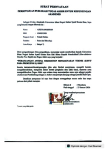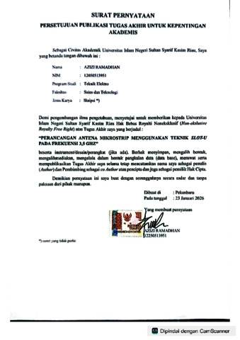 AZIZI RAMADHAN, - (2026) PERANCANGAN ANTENA MIKROSTRIP MENGGUNAKAN TEKNIK SLOT-U PADA FREKUENSI 3,5 GHZ. Skripsi thesis, UNIVERSITAS ISLAM NEGERI SULTAN SYARIF KASIM RIAU.