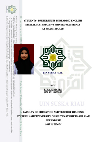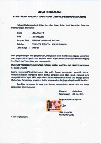 LIRA JUMATRI, - (2026) STUDENTS’ PREFERENCES IN READING ENGLISH DIGITAL MATERIALS VS PRINTED MATERIALS AT SMAN 1 HARAU. Skripsi thesis, Universitas Islam Negeri Sultan Syarif Kasim Riau.