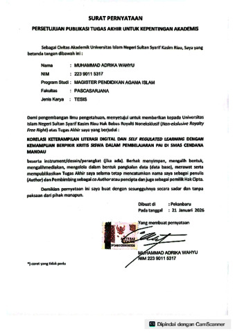 MUHAMMAD ADRIKA WAHYU, - (2026) KORELASI KETERAMPILAN LITERASI DIGITAL DAN SELF REGULATED LEARNING DENGAN KEMAMPUAN BERPIKIR KRITIS SISWA DALAM PEMBELAJARAN PAI DI SMAS CENDANA MANDAU. Thesis thesis, Universitas Islam Negeri Sultan Syarif Kasim Riau.