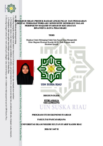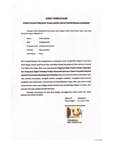 FITRI AMALIA, - (2026) PENGARUH SIKAP, PRODUK RAMAH LINGKUNGAN DAN PEMASARAN DIGITAL TERHADAP PERILAKU KONSUMTIF GENERASI Z DALAM PERSPEKTIF MAQASID SYARIAH DI KECAMATAN BINAWIDYA KOTA PEKANBARU. Thesis thesis, UNIVERSITAS ISLAM NEGERI SULTAN SYARIF KASIM RIAU.
