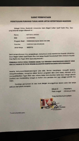 MIFTAHUL JANNAH, - (2026) PENGARUH STATUS SOSIAL EKONOMI ORANG TUA TERHADAP PERKEMBANGAN KOGNITIF ANAK USIA 5-6 TAHUN DI TK PUCUK REBUNG KECAMATAN MARPOYAN DAMAI KOTA PEKANBARU. Skripsi thesis, Universitas Islam Negeri Sultan Syarif Kasim Riau.