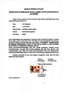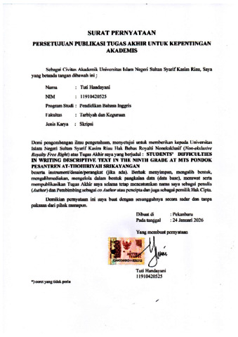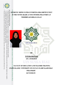 TUTI HANDAYANI, - (2026) STUDENTS’ DIFFICULTIES IN WRITING DESCRIPTIVE TEXT IN THE NINTH GRADE AT MTS PONDOK PESANTREN AT THOHIRIYAH SRIKAYANGAN. Skripsi thesis, UNIVERSITAS ISLAM NEGERI SULTAN SYARIF KASIM RIAU.