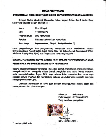 -, ZIQRI HIDAYAT (2026) DIGITAL MARKETING ROYAL ATTIRE RENT DALAM MEMPROMOSIKAN JASA PENYEWAAN JAS DAN KEBAYA DI KOTA PEKANBARU. Skripsi thesis, Uin Sultan Syarif Kasim Riau.