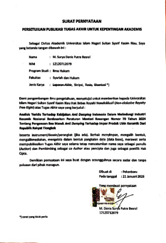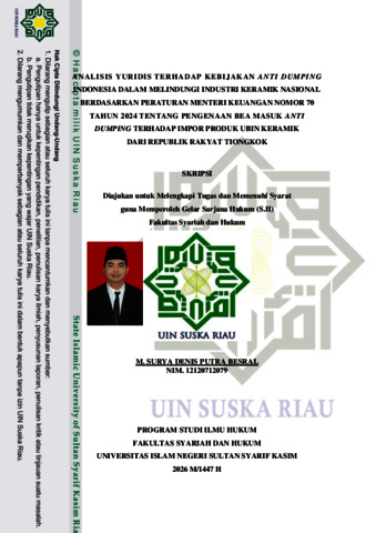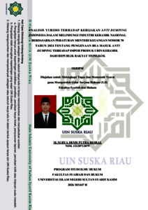 M. Surya Denis Putra Besral, - (2026) ANALISIS YURIDIS TERHADAP KEBIJAKAN ANTI DUMPING INDONESIA DALAM MELINDUNGI INDUSTRI KERAMIK NASIONAL BERDASARKAN PERATURAN MENTERI KEUANGAN NOMOR 70 TAHUN 2024 TENTANG PENGENAAN BEA MASUK ANTI DUMPING TERHADAP IMPOR PRODUK UBIN KERAMIK DARI REPUBLIK RAKYAT TIONGKOK. Skripsi thesis, UNIVERSITAS ISLAM NEGERI SULTAN SYARIF KASIM RIAU.