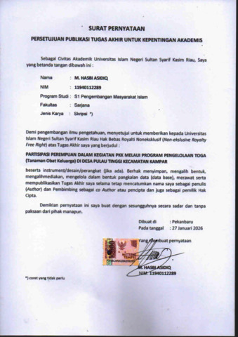 -, HASBI ASIDIQ (2026) PARTISIPASI PEREMPUAN DALAM KEGIATAN PKK MELAUI PROGRAM PENGELOLAAN TOGA (Tanaman Obat Keluarga) DI DESA PULAU TINGGI KECAMATAN KAMPAR. Skripsi thesis, Uin Sultan Syarif Kasim Riau.