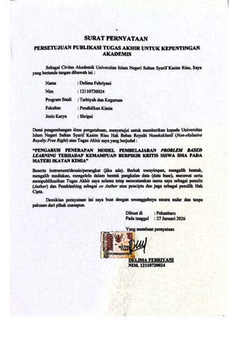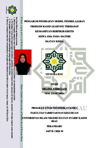 DELIMA FEBRIYANI, - (2026) PENGARUH PENERAPAN MODEL PEMBELAJARAN PROBLEM BASED LEARNING TERHADAP KEMAMPUAN BERPIKIR KRITIS SISWA SMA PADA MATERI IKATAN KIMIA. Skripsi thesis, UNIVERSITAS ISLAM NEGERI SULTAN SYARIF KASIM RIAU.