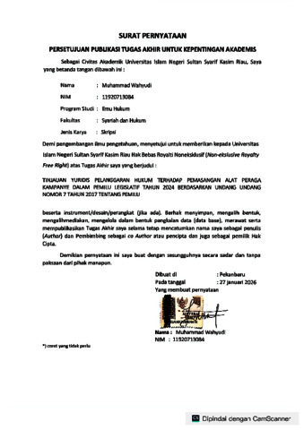 MUHAMMAD WAHYUDI, - (2026) TINJAUAN YURIDIS PELANGGARAN HUKUM TERHADAP PEMASANGAN ALAT PERAGA KAMPANYE DALAM PEMILU LEGISLATIF TAHUN 2024 BERDASARKAN UNDANG-UNDANG NOMOR 7 TAHUN 2017 TENTANG PEMILU. Skripsi thesis, UNIVERSITAS ISLAM NEGERI SULTAN SYARIF KASIM RIAU.