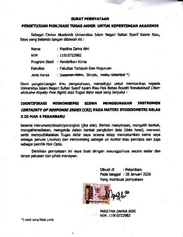 MASITHA ZAHRA AINI, - (2026) IDENTIFIKASI MISKONSEPSI SISWA MENGGUNAKAN INSTRUMEN CERTAINTY OF RESPONSE INDEX (CRI) PADA MATERI STOIKIOMETRI KELAS X DI MAN 4 PEKANBARU. Skripsi thesis, UNIVERSITAS ISLAM NEGERI SULTAN SYARIF KASIM RIAU.