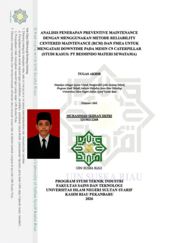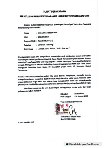 ANALISIS PENERAPAN PREVENTIVE MAINTENANCE DENGAN MENGGUNAKAN METODE RELIABILITY CENTERED MAINTENANCE (RCM) DAN FMEA UNTUK MENGATASI DOWNTIME PADA MESIN C9 CATERPILLAR (STUDI KASUS: PT BESMINDO MATERI SEWATAMA) MUHAMMAD IKHSAN DEFRI NIM. 12150212268 Program Studi Teknik Industri Fakultas Sains dan Teknologi Universitas Islan Negeri Sultan Syarif Kasim Riau Jl. HR. Soebrantas KM. 15 No. 155 Pekanbaru ABSTRAK Mesin C9 Caterpillar merupakan prime mover utama yang digunakan pada unit rig pengeboran di PT. Besmindo Materi Sewatama. Tingginya intensitas penggunaan mesin tersebut menyebabkan frekuensi kerusakan yang cukup tinggi sehingga berdampak pada meningkatnya downtime dan terganggunya kelancaran operasional. Sistem pemeliharaan yang diterapkan sebelumnya belum mampu mengidentifikasi secara optimal komponen kritis yang berpotensi mengalami kegagalan. Penelitian ini bertujuan untuk mengidentifikasi kegagalan fungsi, menentukan komponen kritis, serta menyusun usulan strategi preventive maintenance yang optimal guna menurunkan tingkat downtime dan meningkatkan keandalan mesin. Metode yang digunakan dalam penelitian ini adalah Reliability Centered Maintenance (RCM) yang dipadukan dengan Failure Mode and Effect Analysis (FMEA). Hasil penelitian menunjukkan bahwa sistem pelumasan, sistem pendinginan, turbocharger, injector nozzle, serta fan belt dan tensioner merupakan komponen kritis dengan nilai RPN tertinggi. Usulan strategi perawatan yang dihasilkan berupa kombinasi time directed dan condition directed yang disesuaikan dengan karakteristik masing-masing komponen. Hasil penelitian ini memberikan rekomendasi untuk mengurangi frekuensi kerusakan, menurunkan downtime, serta meningkatkan keandalan dan ketersediaan mesin C9 Caterpillar di PT. Besmindo Materi Sewatama. Kata Kunci: Reliability Centered Maintenance, FMEA, C9 Caterpillar, Downtime