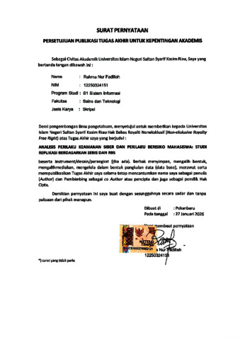 RAHMA NUR FADILLAH, - (2026) ANALISIS PERILAKUKEAMANANSIBERDANPERILAKU BERISIKO MAHASISWA:STUDIREPLIKASI BERDASARKANSEBISDANRBS. Skripsi thesis, UNIVERSITAS ISLAM NEGERI SULTAN SYARIF KASIM RIAU.