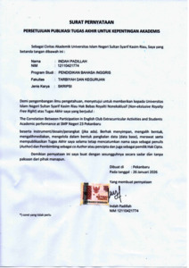 INDAH PADILLAH (2026) THE CORRELATION BETWEEN PARTICIPATION IN ENGLISH CLUB EXTRACURRICULAR ACTIVITY AND STUDENTS ACADEMIC PERFORMANCE AT SMP NEGERI 23 PEKANBARU. Skripsi thesis, Universitas Islam Negeri Sultan Syarif Kasim.