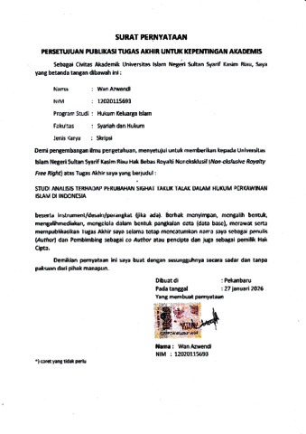 WAN AZWENDI, - (2026) STUDI ANALISIS TERHADAP PERUBAHAN SIGHAT TAKLIK TALAK DALAM HUKUM PERKAWINAN ISLAM DI INDONESIA. Skripsi thesis, UNIVERSITAS ISLAM NEGERI SULTAN SYARIF KASIM RIAU.