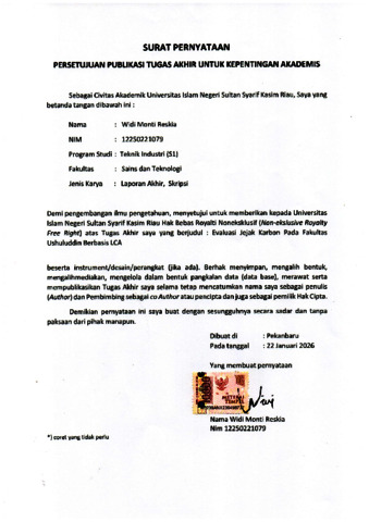 WIDI MONTI RESKIA, - (2026) EVALUASI JEJAK KARBON PADA FAKULTAS USHULUDDIN BERBASIS LCA. Skripsi thesis, UNIVERSITAS ISLAM NEGERI SULTAN SYARIF KASIM RIAU.