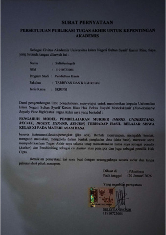 SULISTIANINGSIH (2026) PENGARUH MODEL BELAJAR MURDER (MOOD, UNDERSTAND, RECALL, DIGEST, EXPAND, REVIEW) TERHADAP HASIL BELAJAR SISWA KELAS XI PADA MATERI ASAM BASA. Skripsi thesis, Universitas Islam Negeri Sultan Syarif Kasim.