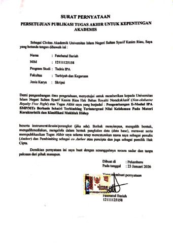 FATEHATUL BARIAH (2026) PENGEMBANGAN E-MODUL IPA SMP/MTs BERBASIS INKUIRI TERBIMBING TERINTERGRASI NILAI KEISLAMAN PADA MATERI KARAKTERISTIK DAN KLASIFIKASI MAKHLUK HIDUP. Skripsi thesis, Universitas Islam Negeri Sultan Syarif Kasim.