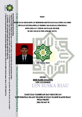 DIDI FARIS SUSANTO, - (2026) HUBUNGAN KEMAMPUAN BERPIKIR KRITIS DAN RASA PERCAYA DIRI DENGAN KETERAMPILAN BERBICARA BAHASA INDONESIA SISWA KELAS V SEKOLAH DASAR NEGERI DI KECAMATAN PEKANBARU KOTA. Thesis thesis, UNIVERSITAS ISLAM NEGERI SULTAN SYARIF KASIM RIAU.