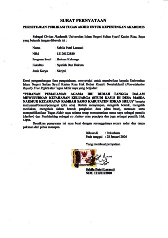 SABILA PUTRI LARASATI, - (2026) PERANAN PEMAHAMAN AGAMA IBU RUMAH TANGGA DALAM MEWUJUDKAN KETAHANAN KELUARGA (Studi Kasus Di Desa Masda Makmur Kecamatan Rambah Samo Kabupaten Rokan Hulu). Skripsi thesis, UNIVERSITAS ISLAM NEGERI SULTAN SYARIF KASIM RIAU.