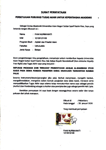 FANI NURMAWATI, - (2026) IMPLIKASI PROGRAM ZIKIR TERHADAP PEMBENTUKAN AKHLAK AL-KHARIMAH STUDI KASUS PADA SISWA PONDOK PESANTREN DARUL MUKHLASIN TSANAWIYAH RUMBAI PALAS. Skripsi thesis, Universitas Islam Negeri Sultan Syarif Kasim Riau.