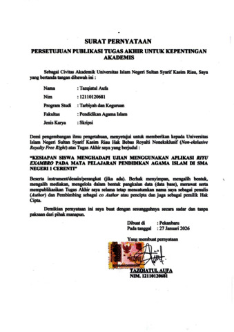 TAZQIATUL AUFA, - (2026) KESIAPAN SISWA MENGHADAPI UJIAN MENGGUNAKAN APLIKASI RIYU EXAMBRO PADA MATA PELAJARAN PENDIDIKAN AGAMA ISLAM DI SMA NEGERI 1 CERENTI. Skripsi thesis, UNIVERSITAS ISLAM NEGERI SULTAN SYARIF KASIM RIAU.