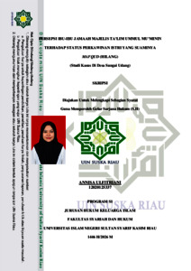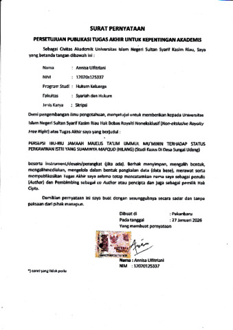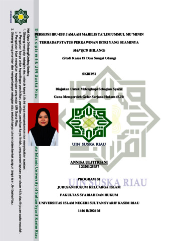 ABSTRAK Annisa Ulfitriani (2026) : Persepsi Ibu-Ibu Jamaah Majelis Ta’lim Ummul Mu’minin Terhadap Status Perkawinan Istri Yang Suaminya Mafqud (Hilang) (Studi Kasus Di Desa Sungai Udang) Penelitian ini mengkaji persepsi ibu-ibu jamaah Majelis Ta‟lim Ummul Mu‟minin terhadap status perkawinan istri yang suaminya mafqud (hilang) di Desa Sungai Udang. Permasalahan utama dalam penelitian ini adalah adanya praktik pernikahan kembali oleh istri yang suaminya mafqud tanpa melalui putusan pengadilan, yang menimbulkan persoalan dari aspek hukum Islam, hukum positif, serta sosial kemasyarakatan. Tujuan penelitian ini yakni: Pertama, untuk mengetahui persepsi ibu-ibu jamaah Majelis Ta‟lim Ummul Mu‟minin terhadap status perkawinan istri yang suaminya mafqud (hilang) di Desa Sungai Udang. Kedua, untuk mengetahui faktor-faktor yang mempengaruhi persepsi ibu-ibu jamaah Majelis Ta‟lim Ummul Mu‟minin terhadap status perkawinan istri yang suaminya mafqud. Jenis penelitian yang digunakan dalam penelitian ini adalah penelitian lapangan (field research) di Desa Sungai Udang Kecamatan Tanah Merah Kabupaten Indragiri Hilir. Jenis data yang digunakan adalah kualitatif. Dalam penelitian ini penulis menggunakan analisa data secara deskriptif kualitatif. Pengumpulan data dilakukan melalui observasi, wawancara, dan dokumentasi terhadap pihak-pihak yang relevan. Hasil penelitian menunjukkan bahwa: Pertama, persepsi ibu-ibu jamaah Majelis Ta‟lim Ummul Mu‟minin terhadap status perkawinan istri yang suaminya mafqud masih beragam. Sebagian berpandangan bahwa perkawinan pertama tetap sah selama belum terdapat putusan pengadilan agama, sementara sebagian lainnya beranggapan bahwa istri dapat menikah kembali setelah suaminya tidak diketahui keberadaannya dalam jangka waktu tertentu. Tingkat pemahaman masyarakat mengenai keharusan adanya penetapan hakim dalam kasus suami mafqud masih relatif rendah. Kedua, faktor-faktor yang mempengaruhi persepsi tersebut antara lain kondisi ekonomi, keterbatasan pemahaman hukum, serta minimnya akses terhadap lembaga peradilan agama. Praktik yang berkembang di masyarakat belum sepenuhnya sejalan dengan ketentuan hukum Islam dan hukum positif, sehingga berpotensi menimbulkan ketidakpastian hukum terkait status perkawinan, nasab, warisan, dan kedudukan anak. Kata Kunci: Persepsi, Perkawinan, Mafqud (hilang), Istri, Majelis Ta‟lim