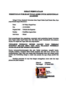 ABSTRAK Sri Wahyu Ningsih Pane (2025): Pengaruh Penerapan Metode Gallery walk terhadap Keaktifan Belajar Siswa pada Mata Pelajaran Pendidikan Agama Islam di SMP Negeri 36 Pekanbaru Penelitian ini bertujuan untuk menguji Pengaruh Penerapan Metode Gallery walk terhadap Keaktifan Belajar Siswa pada Mata Pelajaran Pendidikan Agama Islam di SMP Negeri 36 Pekanbaru. Jenis penelitian ini merupakan penelitian kuantitatif dengan desain penelitian Quasi Eksperimen dengan bentuk Non-equivalent Control Group Design. Populasi penelitian ini seluruh siswa kelas VIII yang mengikuti mata pelajaran Pendidikan Agama Islam di SMP Negeri 36 Pekanbaru yang berjumlah 116 orang, Pengambilan sampel penelitian ini dengan menggunakan Purposive Sampling. Sampel penelitian ini siswa kelas VIII.A berjumlah 24 orang sebagai kelas eksperimen dan VIII B berjumlah 25 orang sebagai kelas kontrol. Teknik pengumpulan data menggunakan observasi, angket dan dokumentasi. Teknik analisis data menggunakan test „‟t‟‟ (Independent Sample t-Test). Berdasarkan hasil penelitian dapat disimpulkan bahwa terdapat pengaruh Penerapan Metode Gallery walk terhadap Keaktifan Belajar Siswa Pada Mata Pelajaran Pendidikan Agama Islam Di SMP Negeri 36 Pekanbaru, diperoleh t hitung > t tabel ( 2,979 > 2,000 ) dan nilai Sig. 2 – tailed 0,005 < 0,05 yang berarti Ha diterima dan Ho ditolak. Kata Kunci : Metode Gallery walk, Keaktifan Belajar Siswa