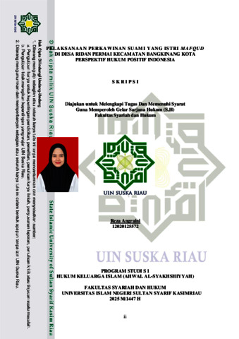 REZA ANGRAINI, - (2026) ii PELAKSANAAN PERKAWINAN SUAMI YANG ISTRI MAFQUD DI DESA RIDAN PERMAI KECAMATAN BANGKINANG KOTA PERSPEKTIF HUKUM POSITIF INDONESIA. Skripsi thesis, UNIVERSITAS ISLAM NEGERI SULTAN SYARIF KASIM RIAU.